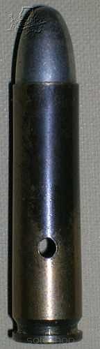 7,62x33 produkcji amerykańskiej. Dwa otwory w łusce, łuska fabrycznie pozbawiona spłonki. W jej miejscu spłonki otwór pod iglicę.