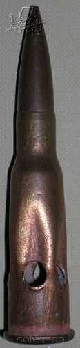 8x50R Lebel produkcji francuskiej. Przeróbka niemiecka na nabój szkolny. W korpusie łuski cztery otwory, dwa otwory w pocisku. Spłonka zbita. Połączenie pocisku z szyjką łuski dodatkowo cynowane w celu wzmocnienia. |