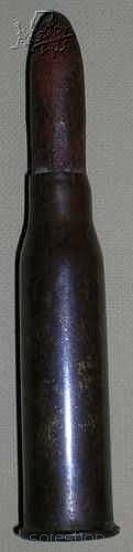 8x50R Mannlicher produkcji austro-węgierskiej. W łusce drewniany wkład z częścią imitująca pocisk. Łuska fabrycznie pozbawiona spłonki. W jej miejscu materiał. |
